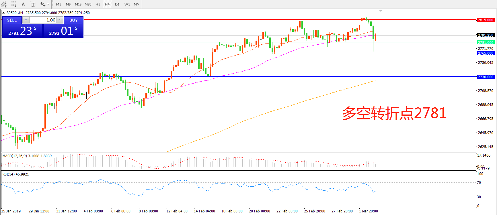 4小时图看,标普500昨日长阴下破均线支撑后小幅反弹,整体仍在强势区间内,但涨势放缓, MACD红柱减少,RSI指标走平,重点关注2781一线支撑。