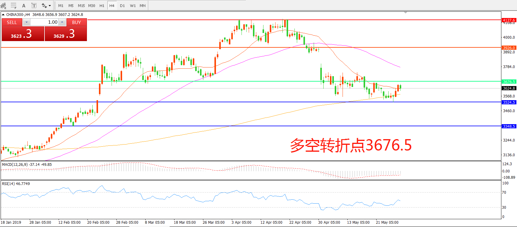4小时图看,沪深300指数在跌破3676.5后陷入震荡走势,振幅逐渐收窄, 200均线成为短期支撑,MACD绿柱缩短,RSI指标拐头向下,日内以震荡下行思路对待。