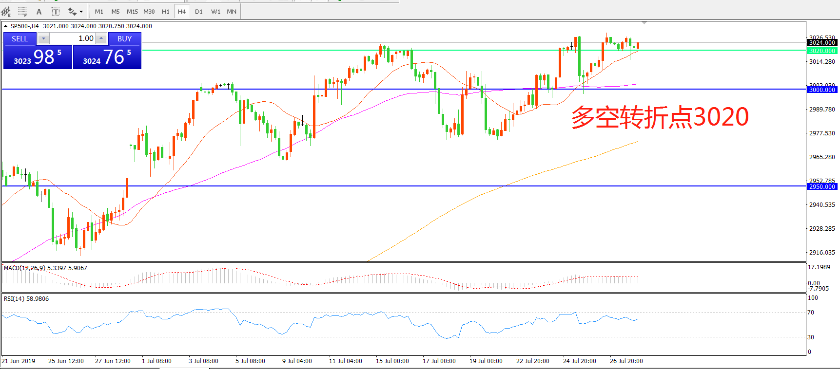 4小时图看,标普500以21周期均线为依托震荡上行,突破3020后表现依然强势,均线系统逐渐呈多头排列,MAC红柱增加,RSI指标走平,日内延续上行概率较大。