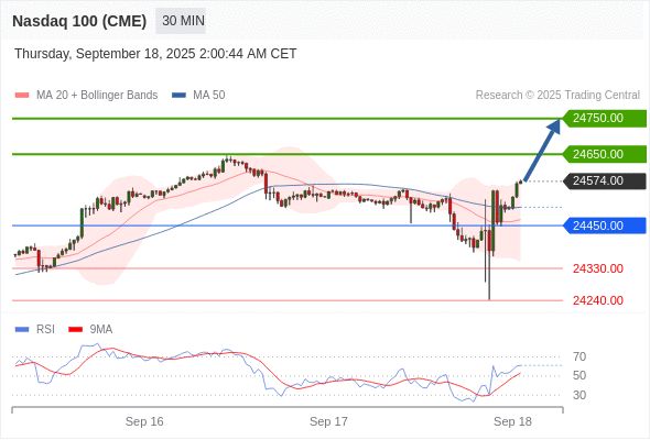 交易策略: 在 24450.00 之上,看涨,目标价位为 24650.00 ,然后为 24750.00 。