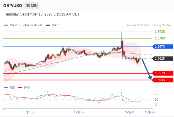 在 1.3670 之下,看跌,目标价位为 1.3570 ,然后为 1.3545 。