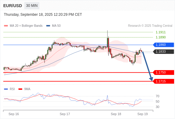 交易策略: 在 1.1860 之下,看跌,目标价位为 1.1750 ,然后为 1.1715 。