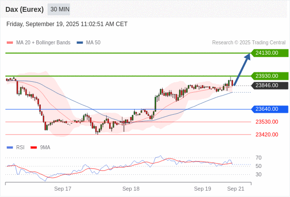 德国DAX指数期货 (Eurex) (Z5) 当日内: 在23640.00之上,看涨。