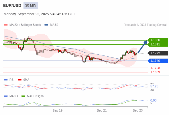 欧元/美元 当日内 : 看涨,当 1.1740 为支撑位,目标定在1.1830。