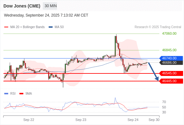 美国道琼斯指数期货 (Z5) 当日内: 短期关键阻力位在46740.00。