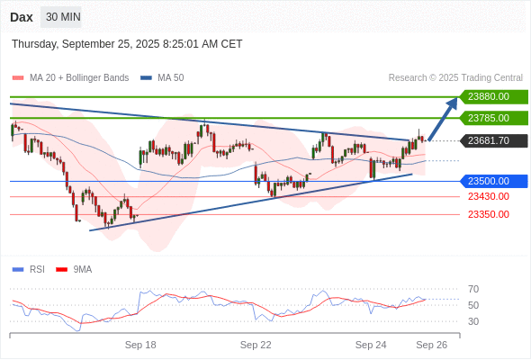 德国DAX指数 当日内: 在23500.00之上,看涨。