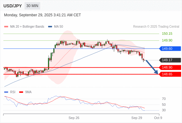 在 149.60 之下,看跌,目标价位为 148.90 ,然后为 148.65 。