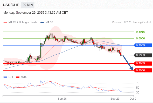 在 0.7985 之下,看跌,目标价位为 0.7945 ,然后为 0.7930 。