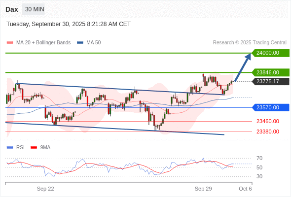 德国DAX指数 当日内: 在23570.00之上,看涨。