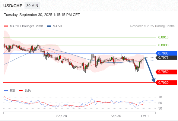 在 0.7985 之下,看跌,目标价位为 0.7950 ,然后为 0.7930 。
