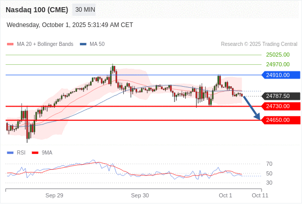 在 24910.00 之下,看跌,目标价位为 24730.00 ,然后为 24650.00 。