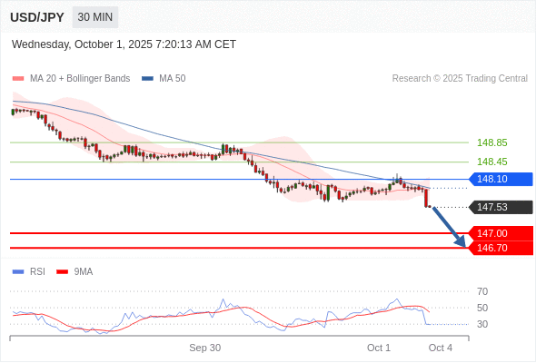 在 148.10 之下,看跌,目标价位为 147.00 ,然后为 146.70 。