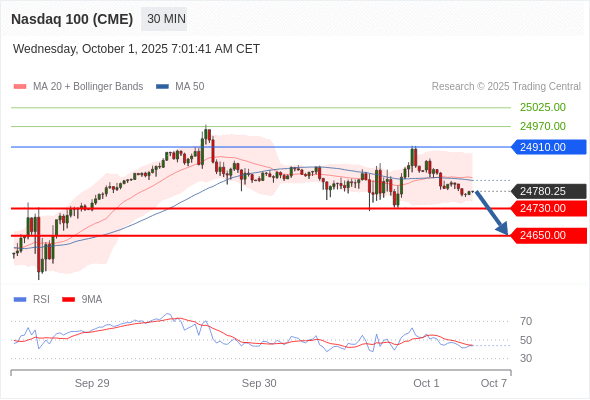 在 24910.00 之下,看跌,目标价位为 24730.00 ,然后为 24650.00 。