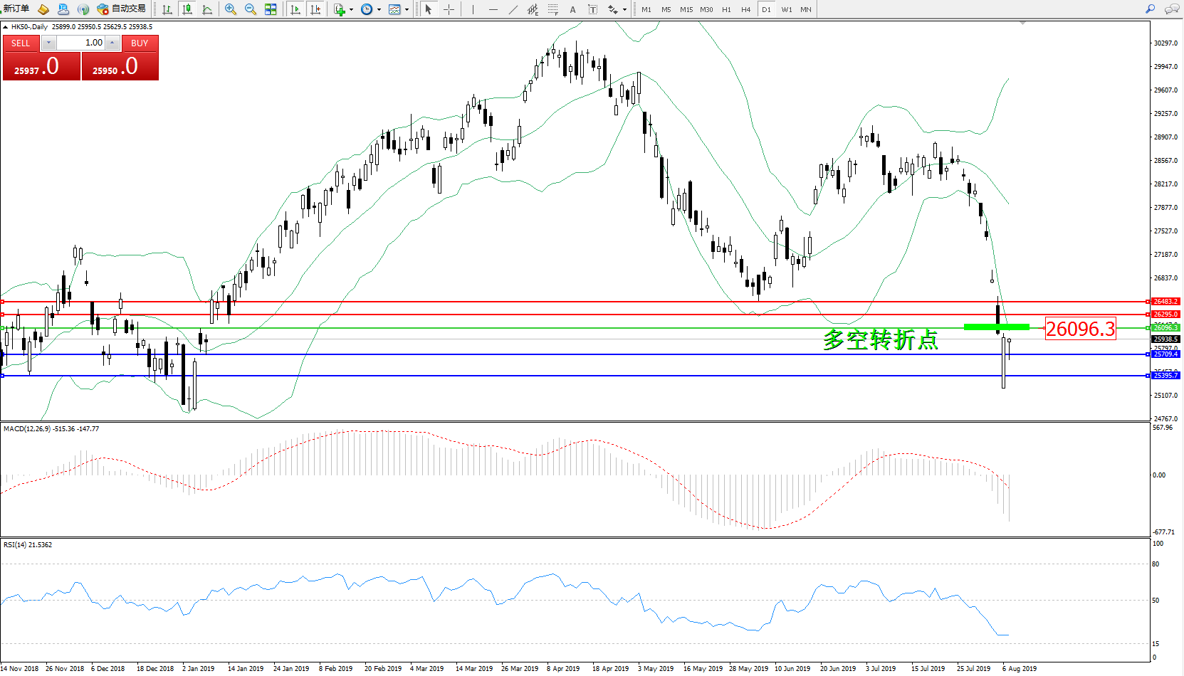 香港恒生指数8月7日(周三)收盘上涨20.79点,涨幅0.08%,报25997.03点;港股早上小幅高开1点后,随后逐步向上,但最多也仅是升43点,恒指高见26019,即见调头回落,未能冲破26000关口。短期内可再抽升的机会不大,而向下试低位的机会比较大。在经济大背景下,恒指被重估的可能性增加,但鉴于整体环境氛围仍较弱,因此从基本面来看,恒指跌幅收窄,也难以扭转恒指中线前景。