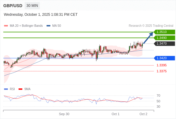 在 1.3420 之上,看涨,目标价位为 1.3490 ,然后为 1.3510 。