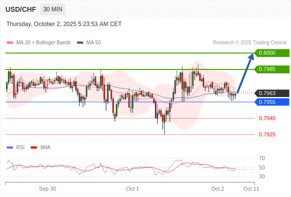 在 0.7955 之上,看涨,目标价位为 0.7985 ,然后为 0.8000 。