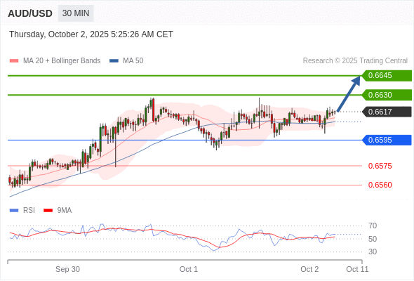 在 0.6595 之上,看涨,目标价位为 0.6630 ,然后为 0.6645 。
