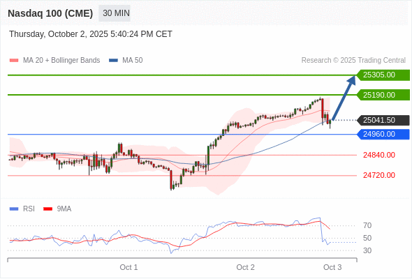 在 24960.00 之上,看涨,目标价位为 25190.00 ,然后为 25305.00 。