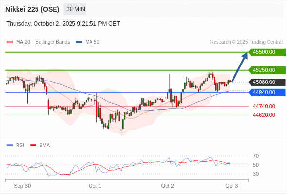 在 44940.00 之上,看涨,目标价位为 45250.00 ,然后为 45500.00 。
