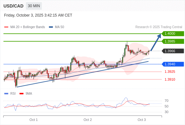 在 1.3940 之上,看涨,目标价位为 1.3985 ,然后为 1.4000 。