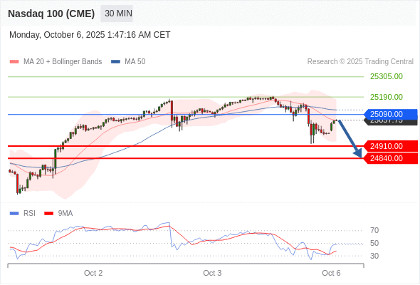 在 25090.00 之下,看跌,目标价位为 24910.00 ,然后为 24840.00 。