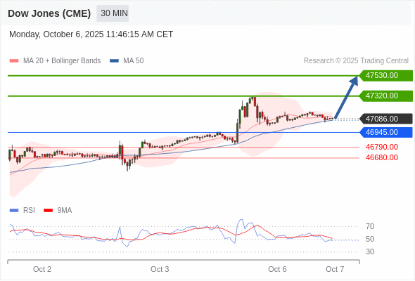 在 46945.00 之上,看涨,目标价位为 47320.00 ,然后为 47530.00 。