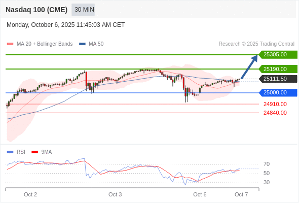 在 25000.00 之上,看涨,目标价位为 25190.00 ,然后为 25305.00 。