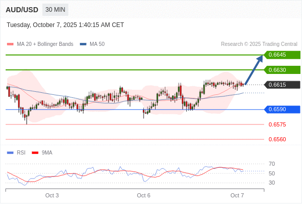 在 0.6590 之上,看涨,目标价位为 0.6630 ,然后为 0.6645 。