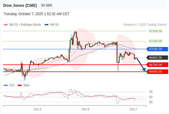 在 47035.00 之下,看跌,目标价位为 46790.00 ,然后为 46680.00 。