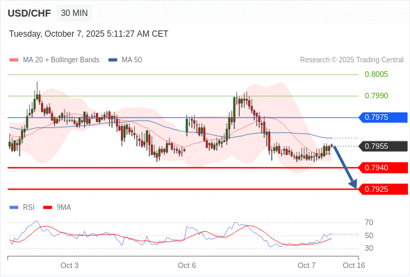 在 0.7975 之下,看跌,目标价位为 0.7940 ,然后为 0.7925 。