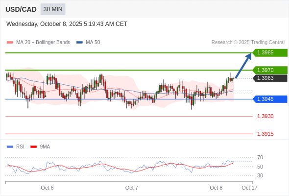 在 1.3945 之上,看涨,目标价位为 1.3970 ,然后为 1.3985 。