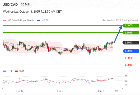 在 1.3945 之上,看涨,目标价位为 1.3985 ,然后为 1.4000 。