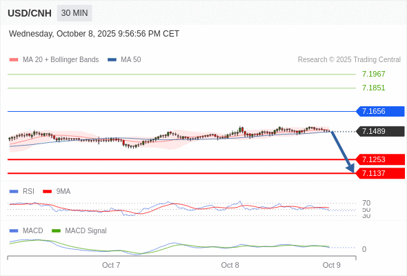 备选策略: 如突破 7.1656 ,USD/CNH 目标方向为 7.1851 和 7.1967 。