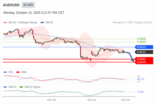 澳元/美元 当日内 : 当 0.6533 维持阻力位时,看跌,目标锁定在 0.6470 。
