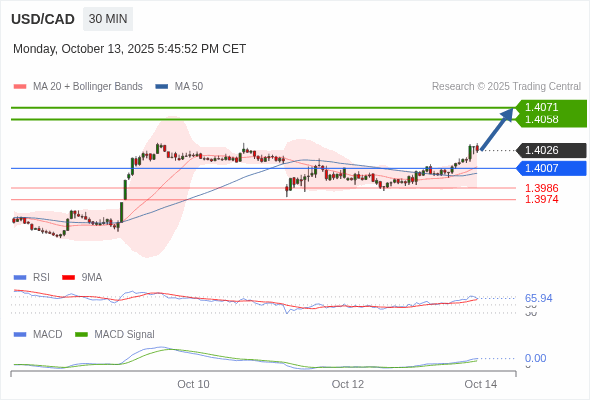 美元/加元 当日内 : 看涨,当 1.4007 为支撑位。