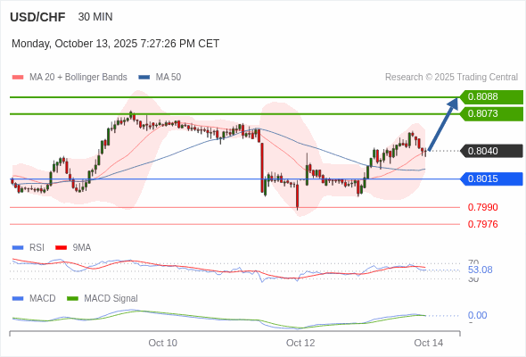 美元/瑞郎 当日内 : 看涨,当 0.8015 为支撑位,目标定在0.8088。