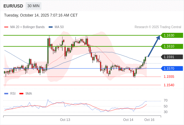 在 1.1570 之上,看涨,目标价位为 1.1610 ,然后为 1.1630 。