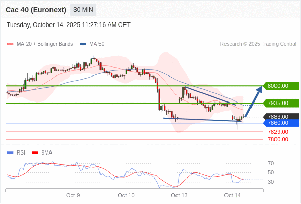 法国CAC指数期货 (Euronext) (V5) 当日内: 超短线(当日内)支撑位在7860.00附近。
