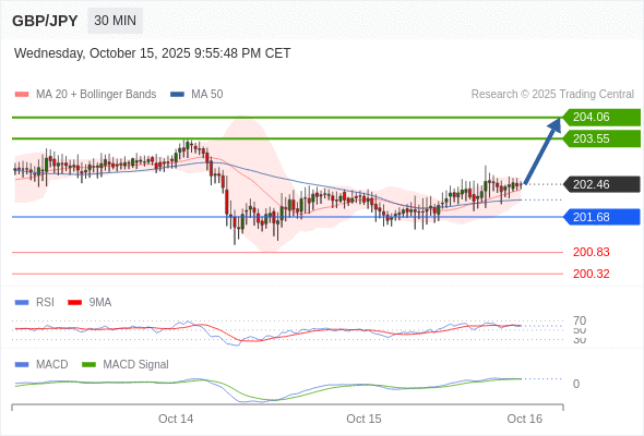 英镑/日元 当日内: 看涨,当 201.68 为支撑位。