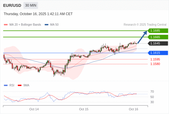 在 1.1615 之上,看涨,目标价位为 1.1665 ,然后为 1.1685 。