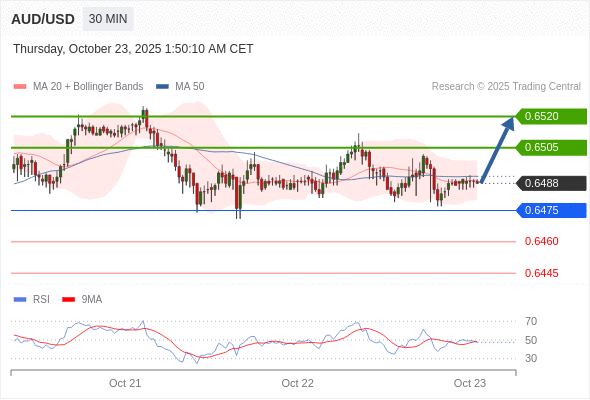 澳元/美元 当日内: 在0.6475之上,看涨。