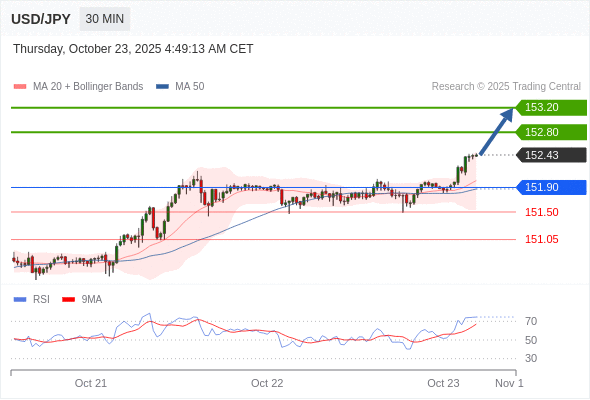 在 151.90 之上,看涨,目标价位为 152.80 ,然后为 153.20 。