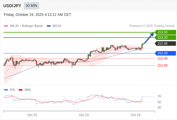 在 152.30 之上,看涨,目标价位为 153.20 ,然后为 153.50 。