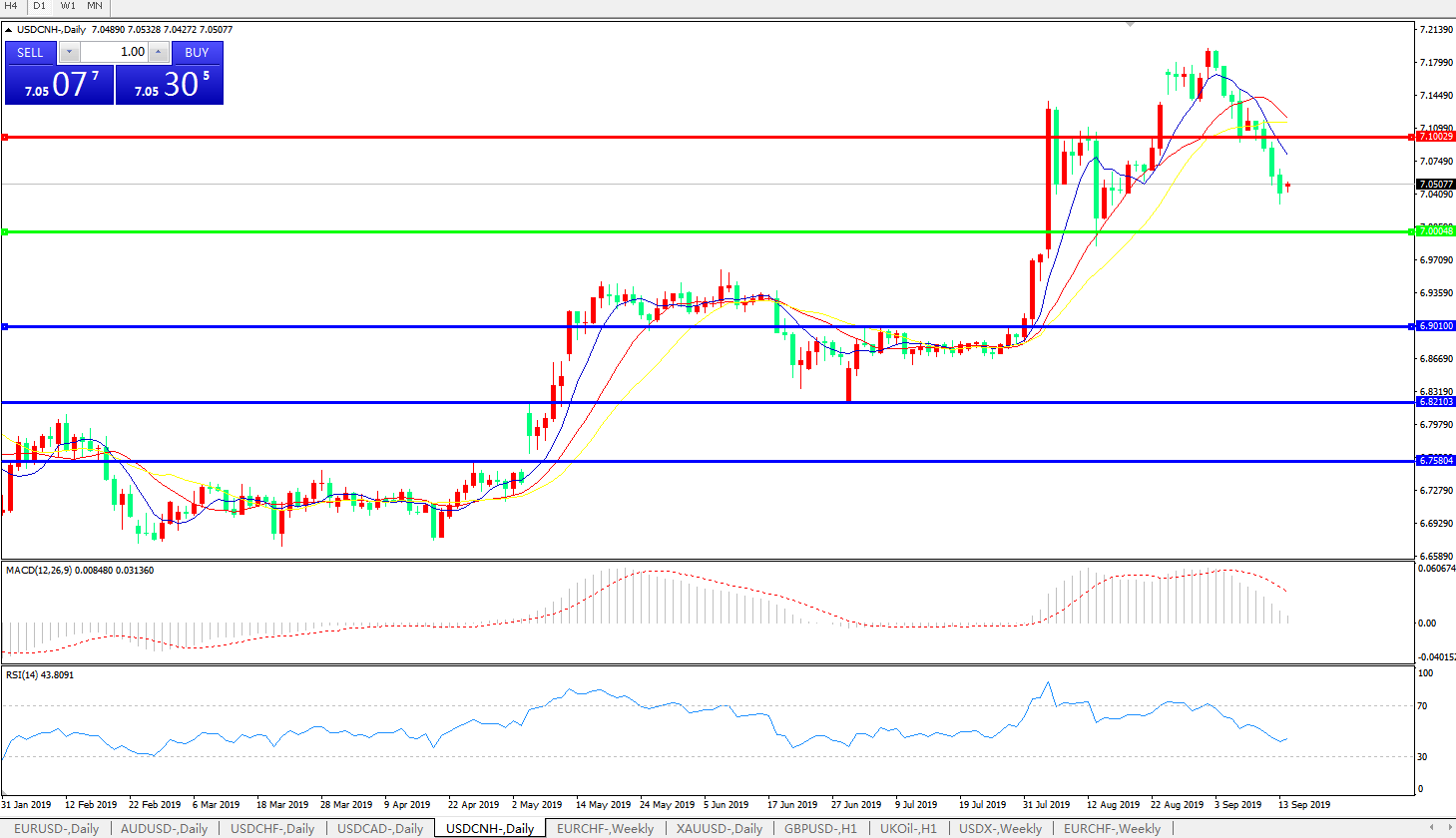 技术面简析:日图均线整体呈下行态势,汇价弱势下行逼近7.0整数关口,MACD自高位向下运行且动能有持续缩量迹象,RSI呈逐步下行态势,预计短期汇价将继续回落下行,上方重点关注7.10-7.20-7.30区间的压制;中美贸易谈判后续进展决定汇价中期走势。