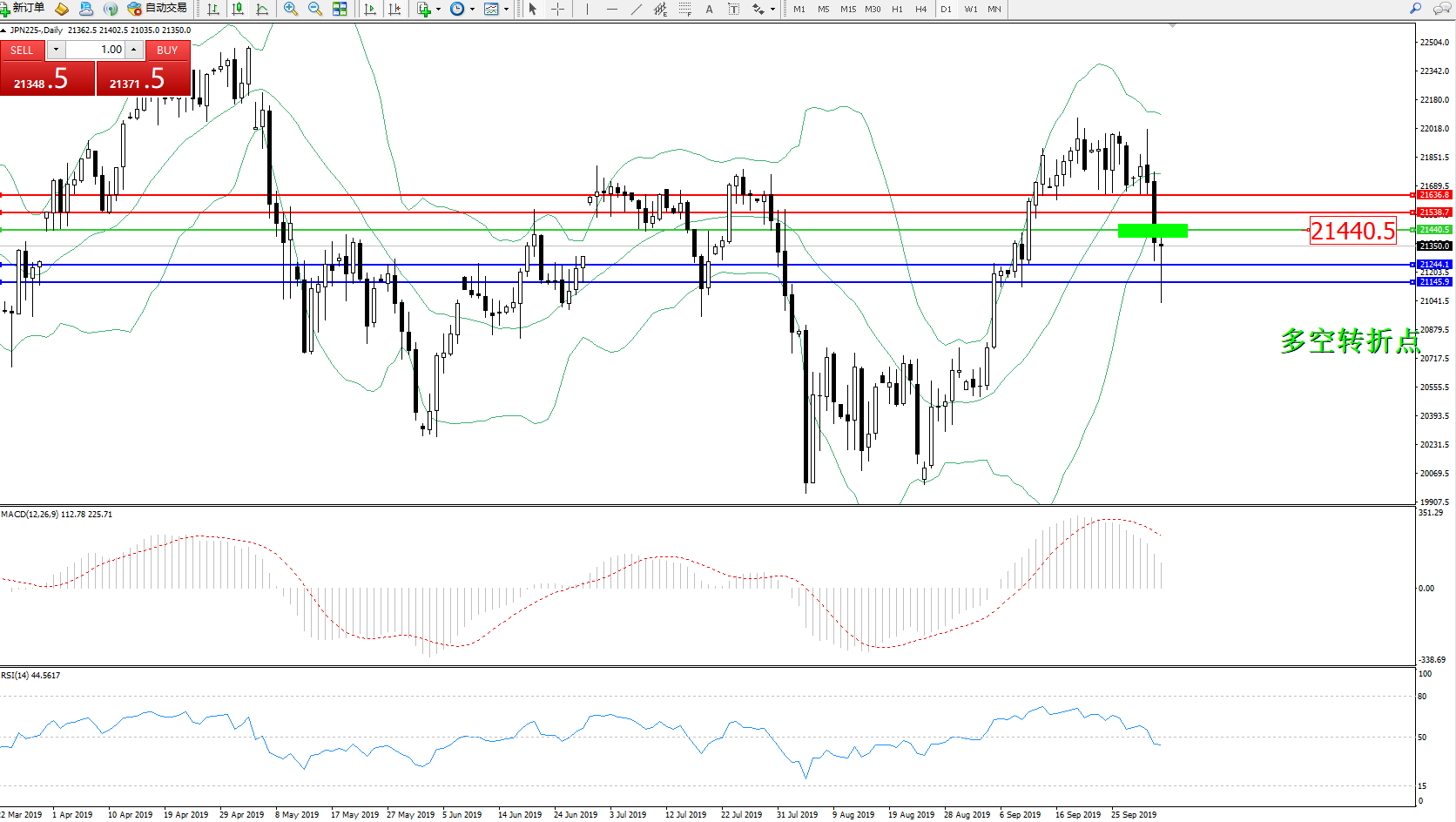 技术点评:多头处于高位维持数日震荡后空头动力强势入场,跌破布林带下轨后呈超长下影线十字星走势,有进一步下行态势,空头动力强劲,MACD指标多头区域高位缓慢下移,RSI指标处于多头区域弱势震荡后跌破50均衡线进入空头区域徘徊;