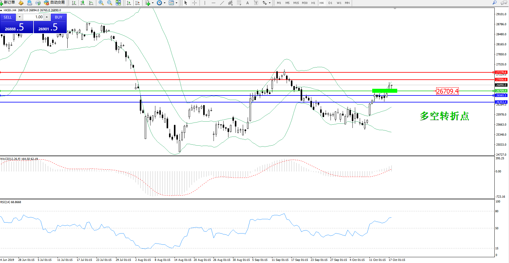 香港恒生指数10月17日(周四)收盘上涨184.21点,涨幅0.69%,报26848.49点;港股早间高开后,曾小量收窄升幅,随后再穏步上扬,恒指拉高26956位置,距离27000点近在咫尺。唯关口前略见压力,始终未能冲破。美国零售销售数据自今年2月以来首次下滑,加剧经济忧虑,市场对美国连续第三次降息的预期也有所升温。人民币汇价近日亦有转弱迹象,某程度上亦会不利恒指表现,因此恒指能否进一步上升仍有待观察。