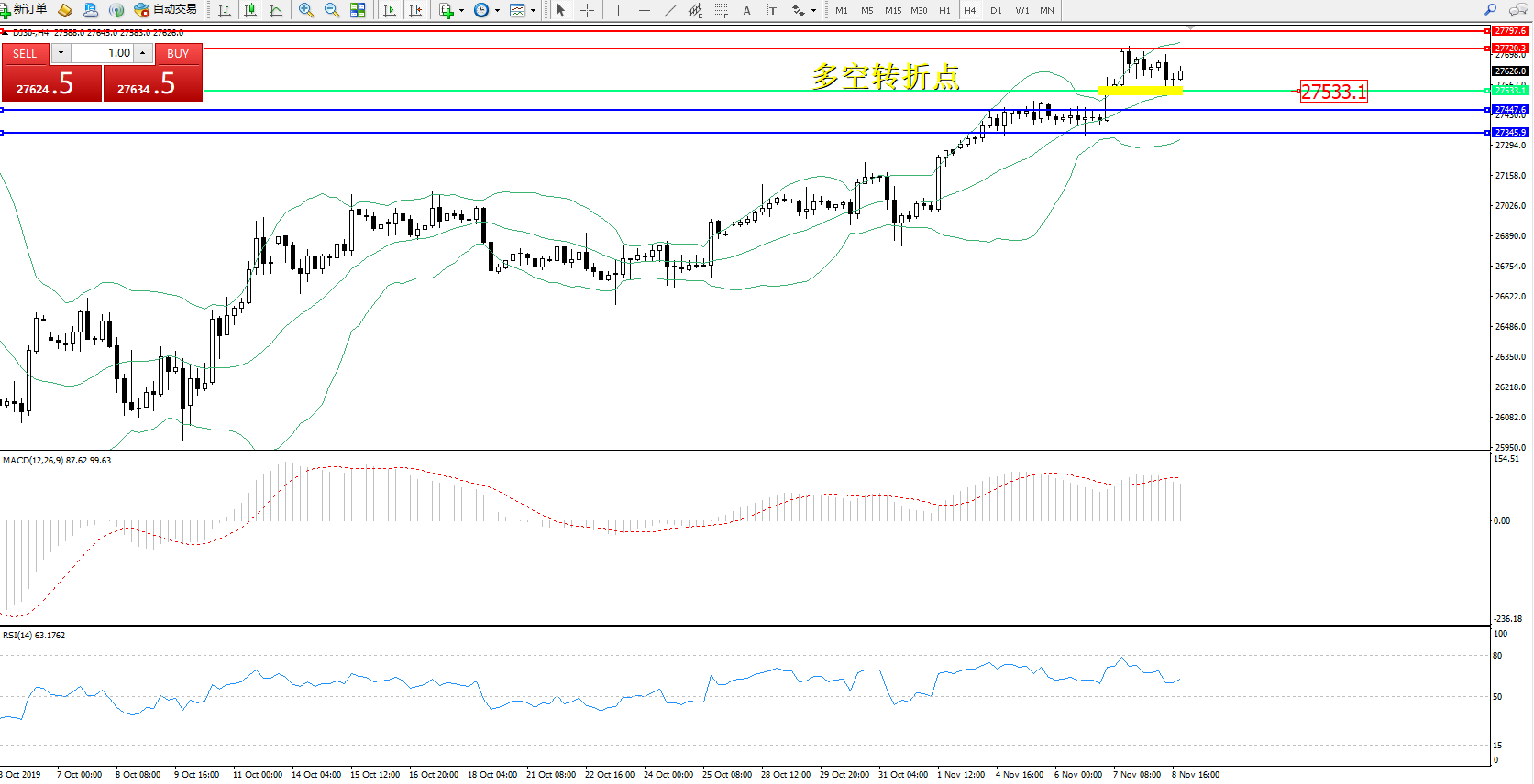 道琼斯指数11月8日(周五)收盘上涨6.40点,涨幅0.02%,报27681.24点。因贸易紧张局势持续,美元可能会保持强势,虽然我们预期相对利率不会短期内进一步提振美元,持续的贸易紧张关系和全球经济放缓意味着美元将在2020年进一步小幅上升,尽管事实上,美元的贸易加权指数已经迫近2000年代初以来的最高水平。
