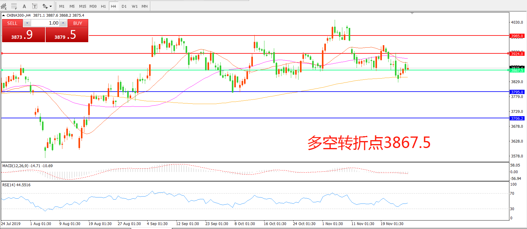 4小时图看,沪深300延续低位震荡,200周期均线成为短期支撑,中期均线成为上方阻力,MACD红柱增加,RSI指标向上,日内维持震荡概率较大。