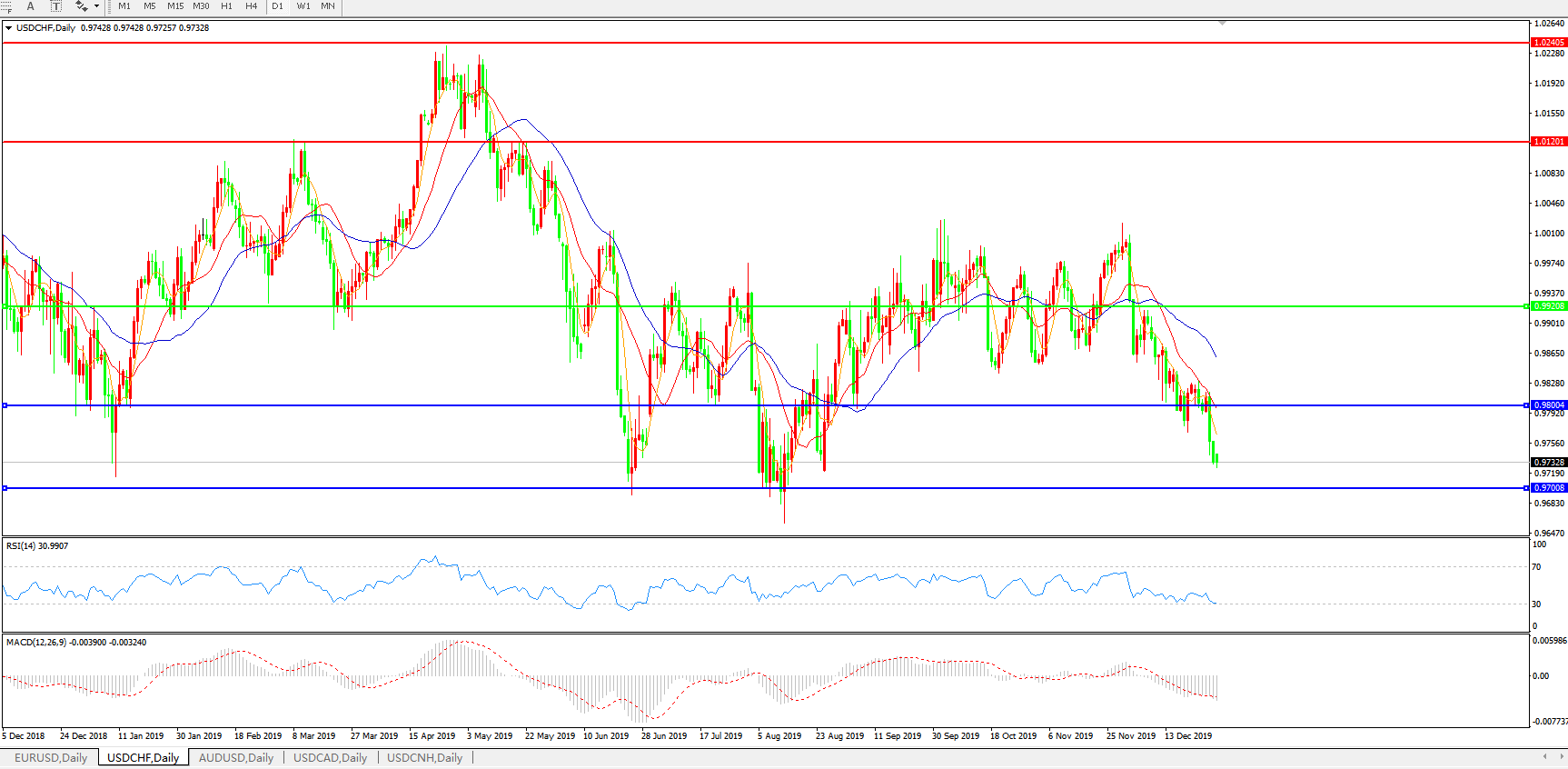 美元兑瑞郎在周五欧市盘初再现跳跌,触及日低0.9766,这也是自8月26日以来四个月新低,主要原因在于圣诞节假期后欧洲市场恢复开盘之际欧系货币受市场仓位调整影响普涨,带动了瑞郎一并走强。同时,投资者对应明年美国大选年所带来的政治经济扰动仍有所忌惮,令美元加倍承压,而避险货币瑞郎则受到追捧;分析师指出,在进入2020年之后,全球经济及贸易前景仍然存在变数,同时,英国脱欧和美国大选等国际地缘政治事件还会强化市场担忧心理,在此状况下,避险货币瑞郎理应会受到进一步热捧,汇价可能继续走强; 美元兑瑞郎此后的下跌目标将是今年8月初的低点0.9660,失守该点位将意味着美元兑瑞郎自2018年2月以来的反弹趋势彻底破溃。然而,瑞郎过度走强可能引发瑞士央行兑现其之前承诺再度入市干预,这将为其明年走势带来额外不确定性。