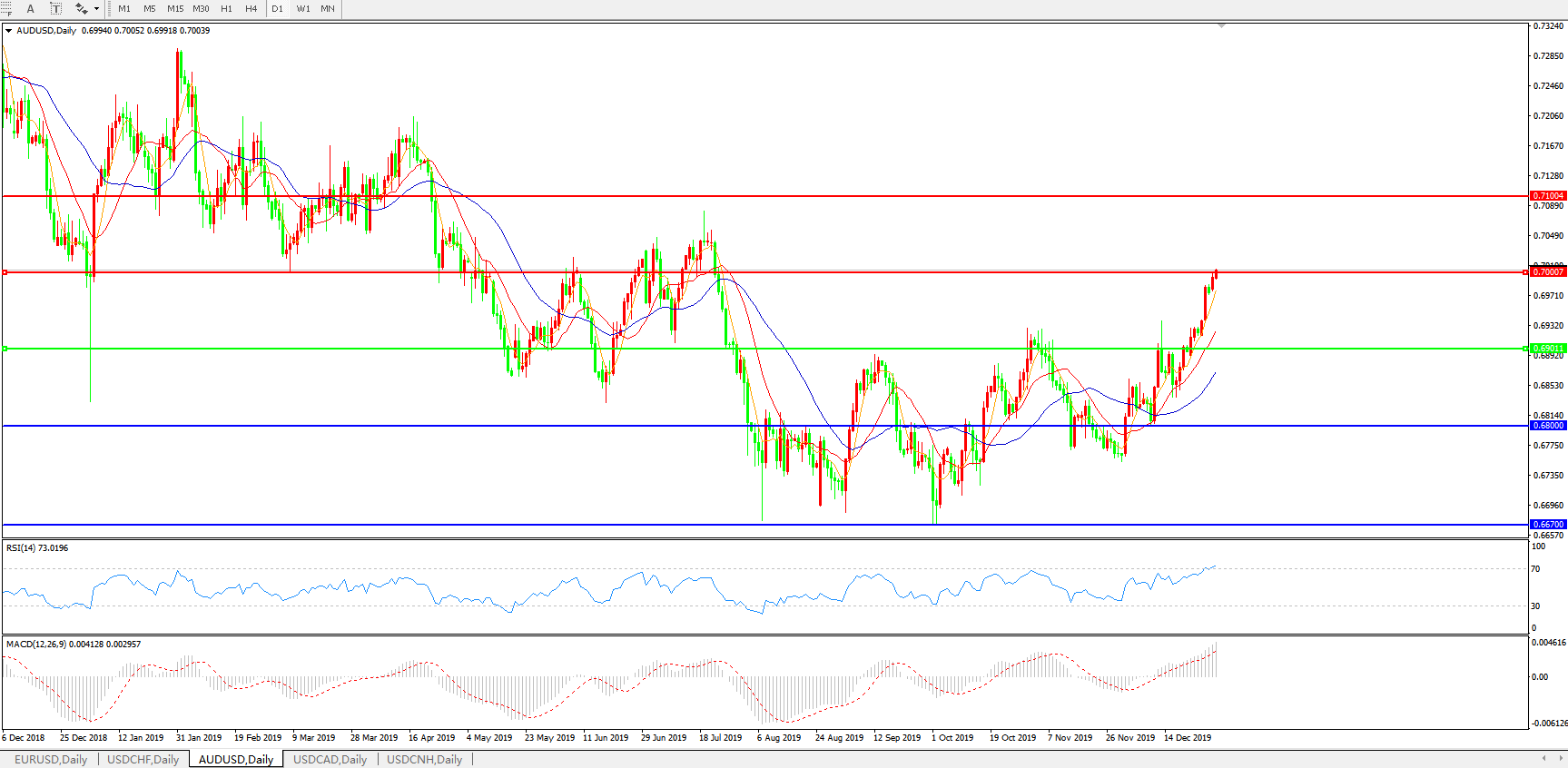 澳元兑美元在周一开盘后短暂上触0.70心理关口,但旋即在该点位受阻。此前,美元指数自上周后半段以来持续承压,下行趋势到周一仍在延续,这使得非美货币持续走强的趋势还在延续; 特别地,澳新商品系货币更加受到了全球贸易前景转暖的推动,并在近期录得了持续的涨势,而业内分析机构对全球经济在2020年的进一步向好前景则令风险货币继续被看到; 市场正在期待周二中国方面发布的12月PMI数据,该数据如果一如预期显示经济继续回温,将进一步推升市场乐观情绪,并带动澳元走强。一旦澳元兑美元有效升破0.70关口,那么后市将进一步打开升向7月高点0.7082的通道,而触及该点位将彻底确认澳元兑美元的中期反转走势。